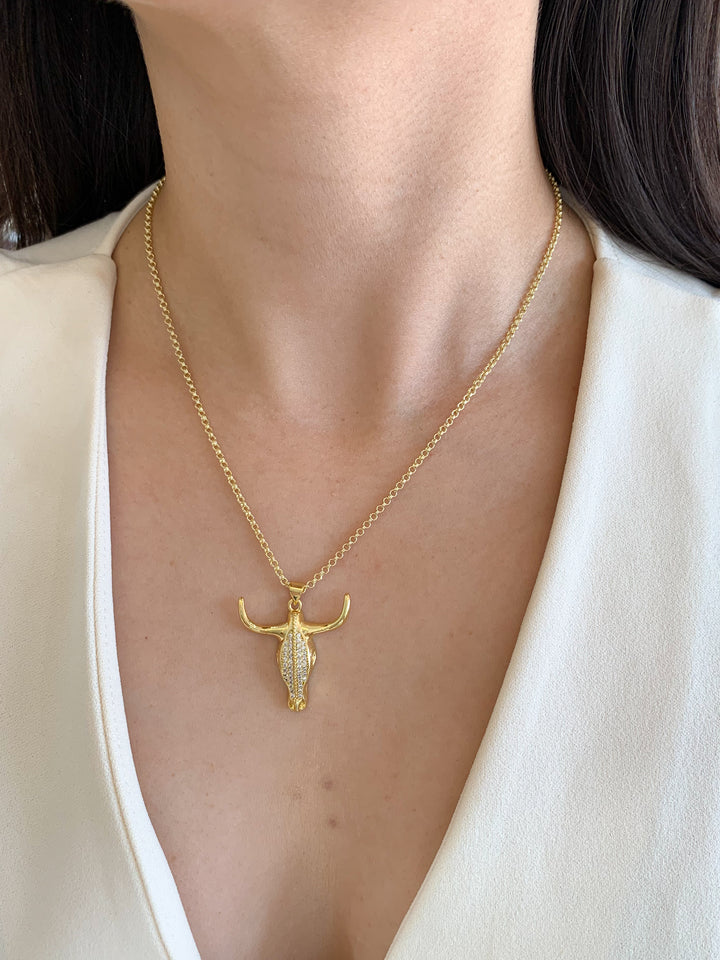 Fuerza y brillo en una sola pieza ✨🐂 Este collar dorado con dije de toro grabado y detalles con zirconia es una declaración de estilo audaz. Perfecto para elevar cualquier look con un toque místico y poderoso