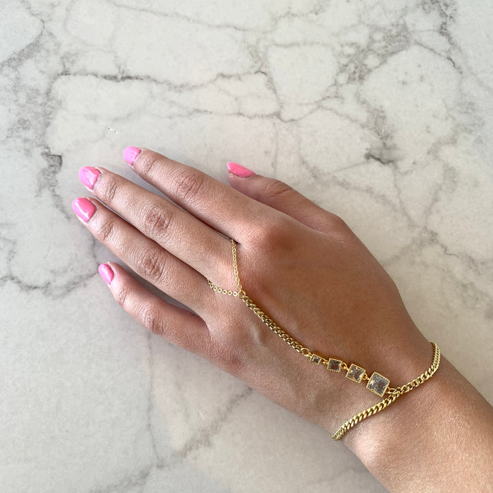 Para quienes aman los accesorios diferentes, esta pieza conecta muñeca y dedo con una delicada cadena dorada y brillos cuadrados. Moderna y atrevida. 💫💍