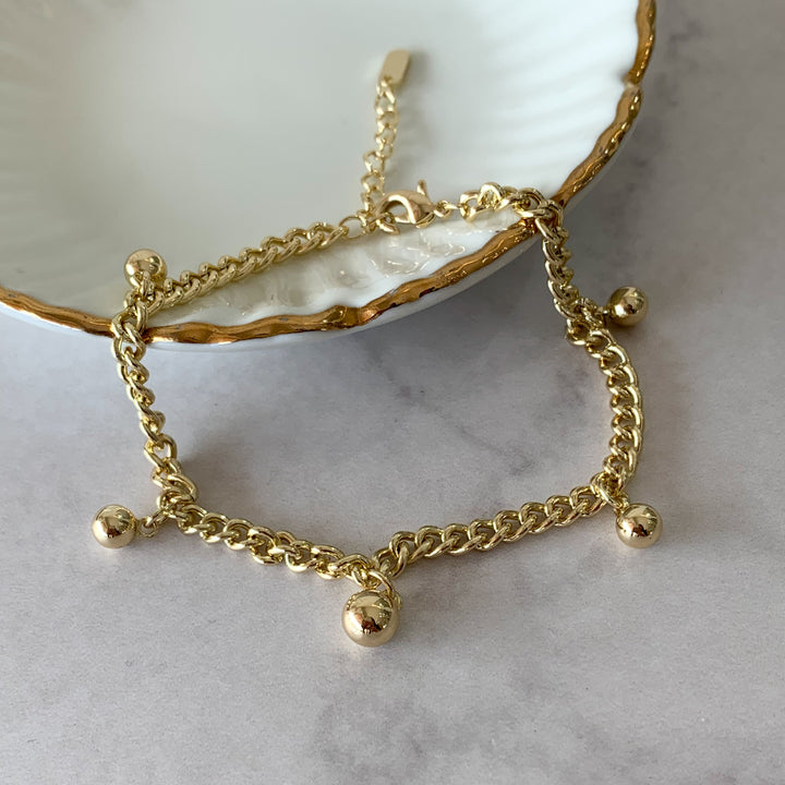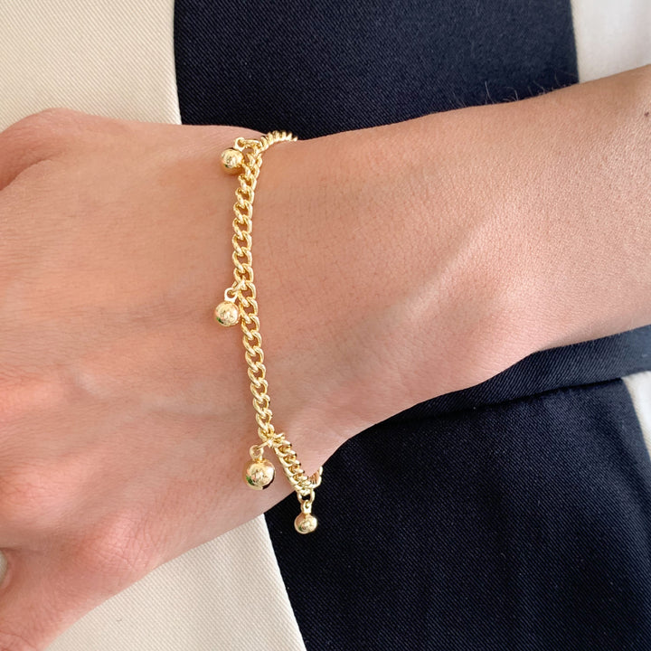 Divertida, con movimiento y muy combinable. Las bolitas doradas cuelgan suavemente, creando un efecto dinámico y coqueto. Perfecta para apilar 💫
