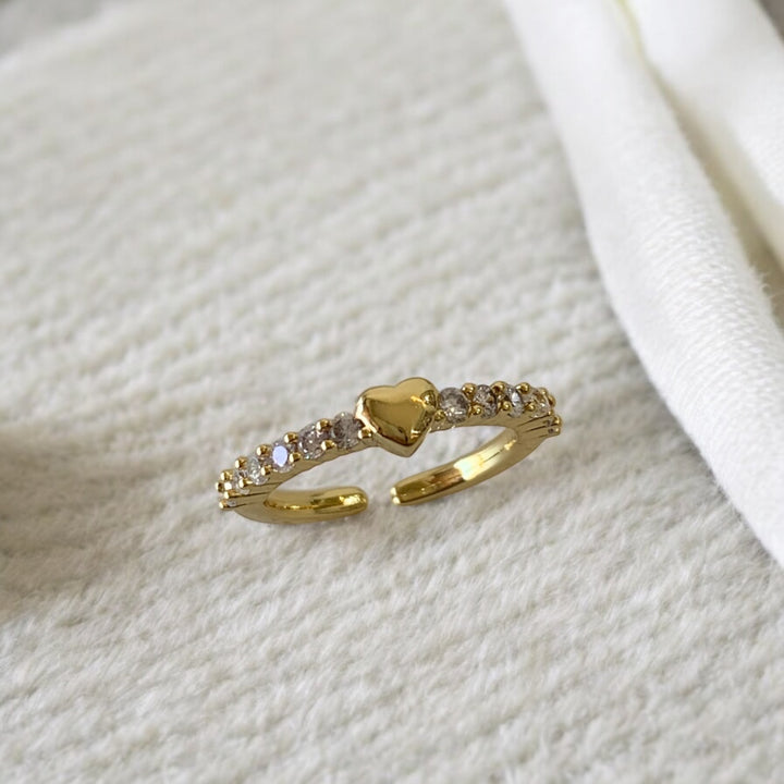 Romántico y femenino, este anillo presenta un corazón dorado al centro rodeado de pequeños brillitos 💖. Ideal para quienes aman los detalles dulces y delicados