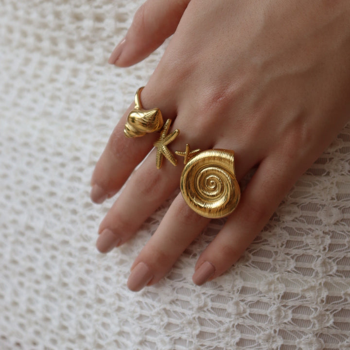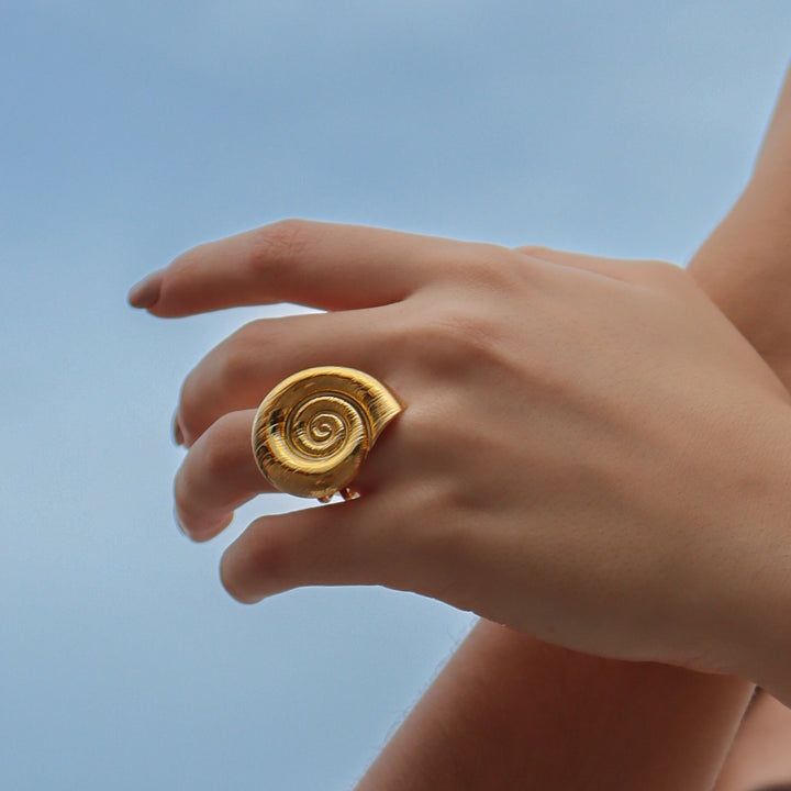 Una espiral de estilo 🌪️ Con su diseño de caracol grande y dorado, este anillo es el detalle perfecto para darle un toque diferente a tus manos🏖️🌟