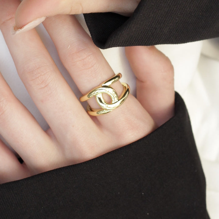 Un diseño que envuelve tus dedos con personalidad 💛 La forma entrelazada representa conexión y fuerza, mientras el acabado dorado hace que brille por sí solo. Perfecto para llevar solo o combinarlo con otros anillos.