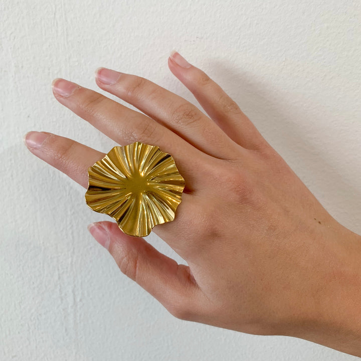Una pieza escultórica en tono dorado que juega con formas orgánicas y movimiento 🎨. Ideal para quienes aman diseños únicos que cuentan historias. Se ajusta fácilmente y es un verdadero statement ring