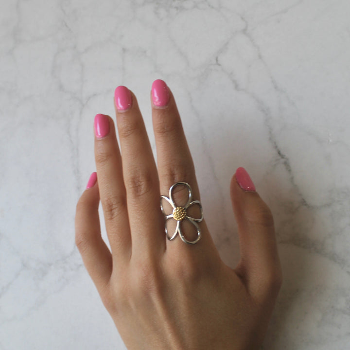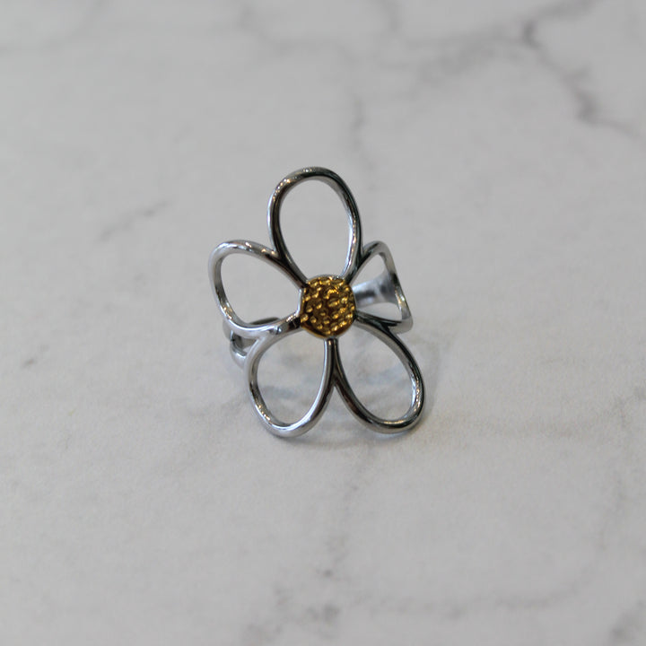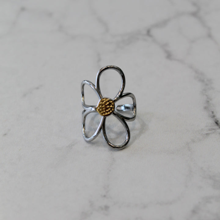 Romántico y moderno, este anillo combina dorado y plateado en forma de una flor estilizada 🌸 Su diseño abierto y ajustable lo hace cómodo y fácil de llevar, además de añadir un toque artístico a cualquier outfit.
