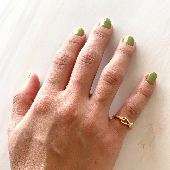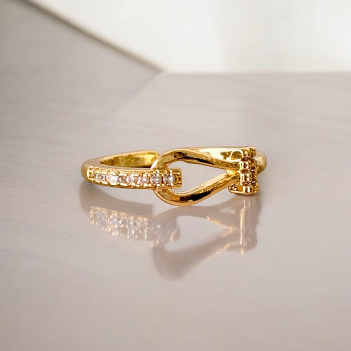 Moderno y minimalista, este anillo con forma de hebilla y detalles con brillos es ideal para looks casuales con toque chic ✨