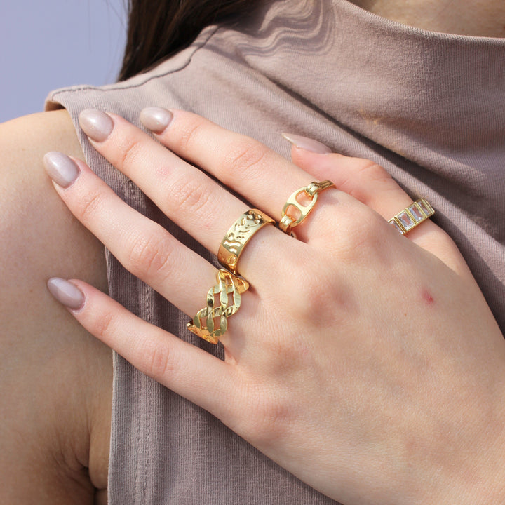 Un modelo inspirado en el clásico “sodas”, pero en versión dorada más chunky 🫧 Lleno de textura, perfecto para quienes aman mezclar anillos diferentes con un look bold.
