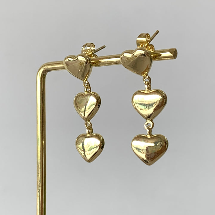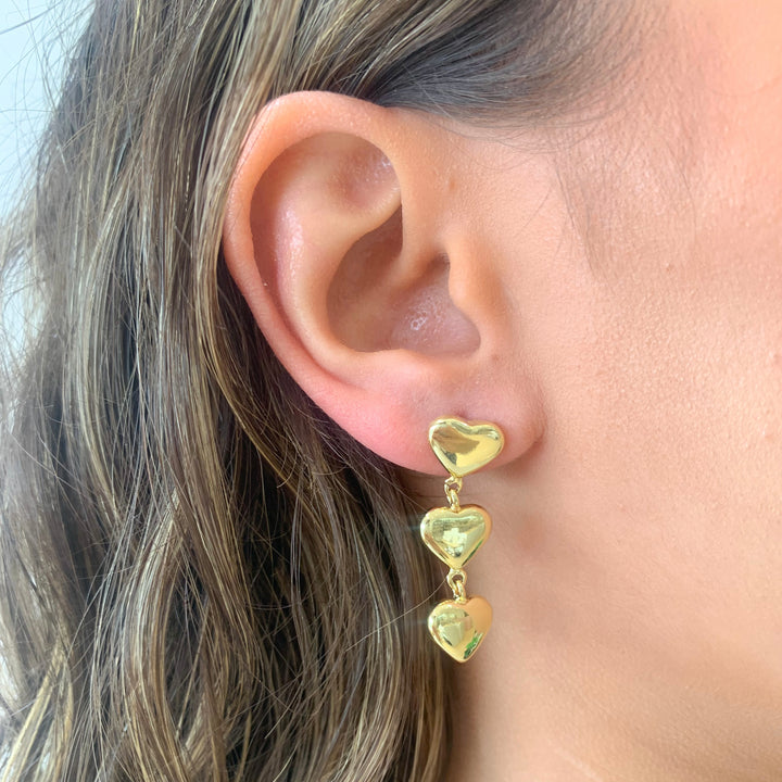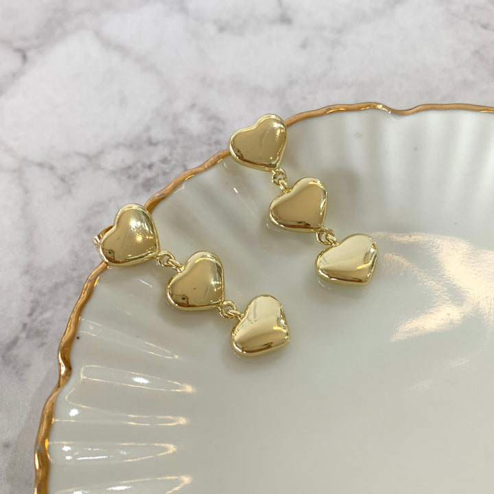Tres corazones dorados alineados para un look dulce y llamativo.