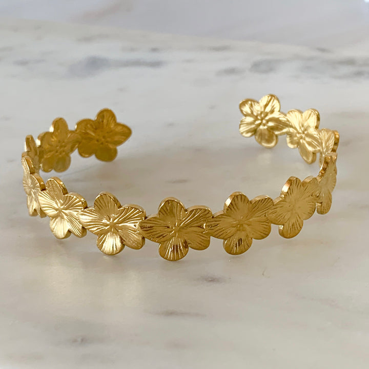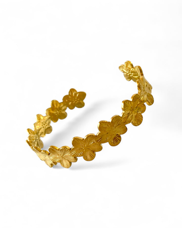 Un jardín dorado en tu muñeca 🌼. Esta pulsera tipo cuff está formada por flores delgadas y delicadas que crean una pieza artística y femenina