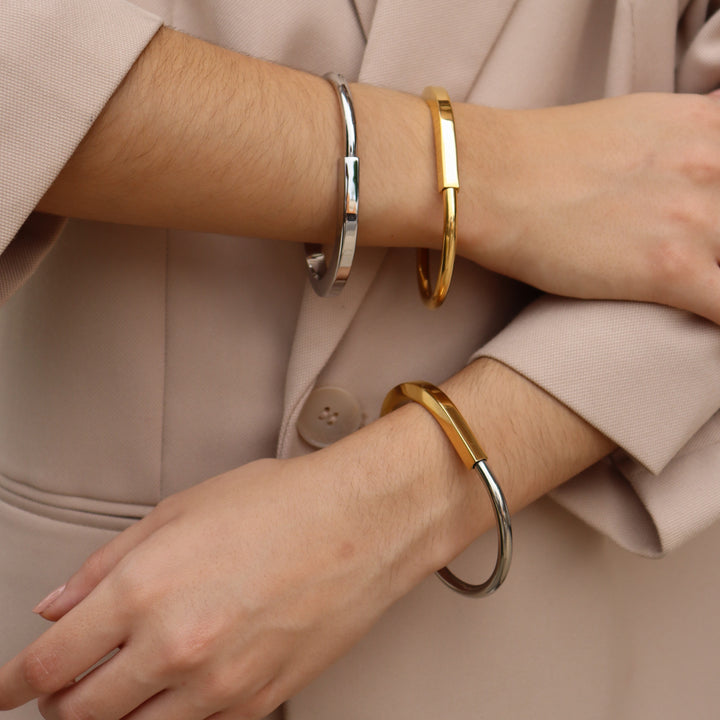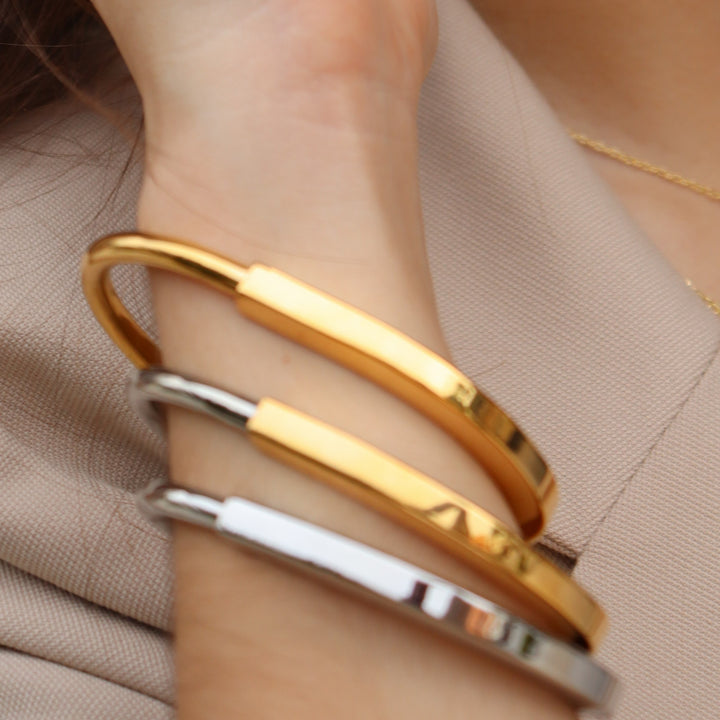 Actitud metálica 🔒. Brazalete tipo rígido con cierre/candado decorativo, estilo industrial-femenino. Ideal para looks minimalistas que necesitan un detalle con carácter.