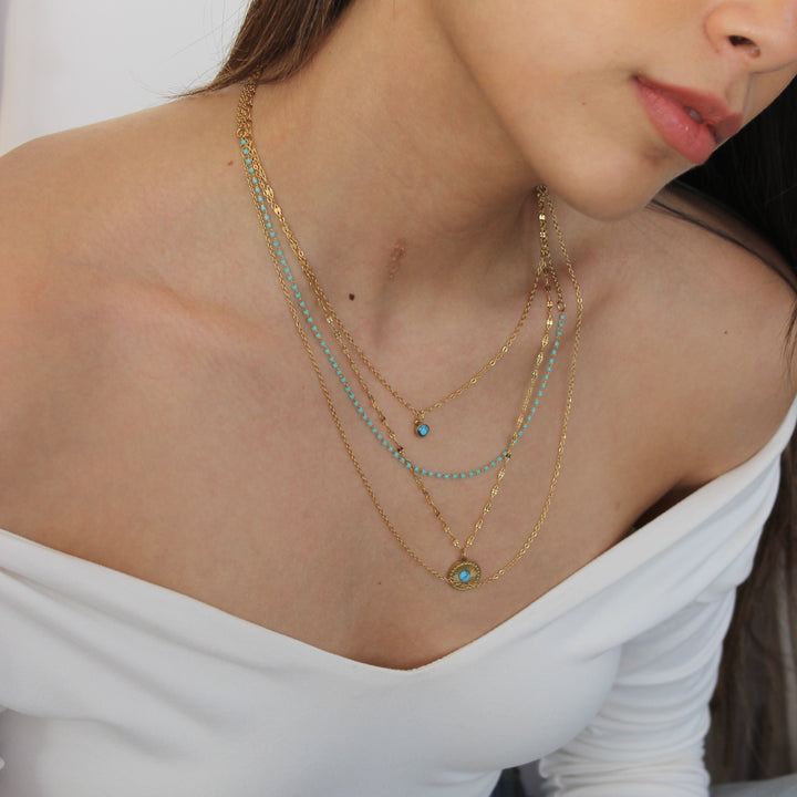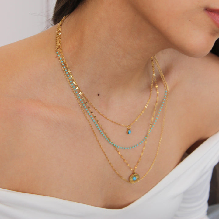 Un layering ya armado 💙 Este collar combina diferentes niveles de cadenas doradas con cuentas color turquesa y un dije central. Súper femenino, fresco y con vibes veraniegas.