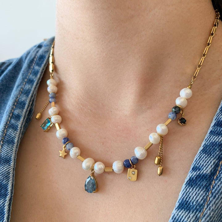 Naturaleza y elegancia en una joya 💙 Las perlas combinadas con piedras azules y dijes dorados crean una pieza única, artística y llena de estilo💎✨
