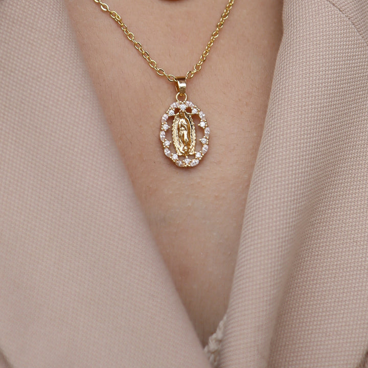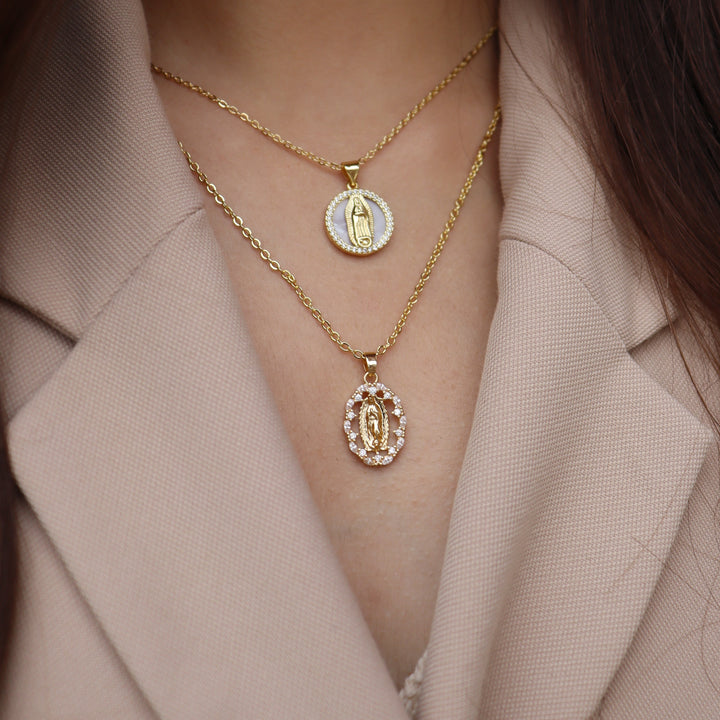 Devoción y estilo en una sola pieza 🙏 Con su diseño ovalado y marco de brillitos, este collar es delicado pero lleno de presencia. Ideal para quienes buscan piezas con simbolismo.📿✨