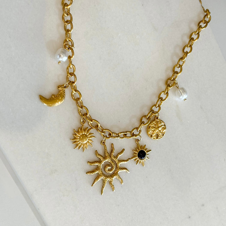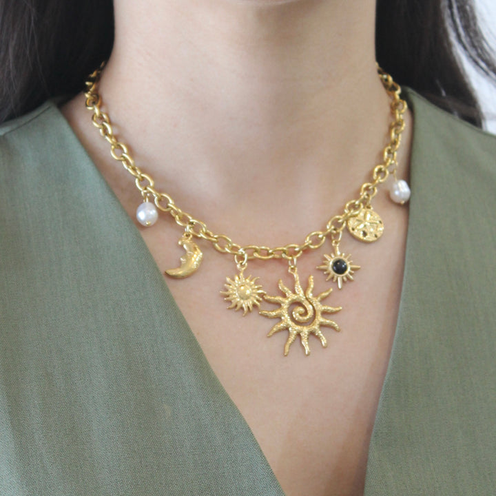 Un mix celestial. Soles, lunas y perlas en un diseño vibrante con mucha energía. Ideal para espíritus libres y soñadoras ☀️🌙✨