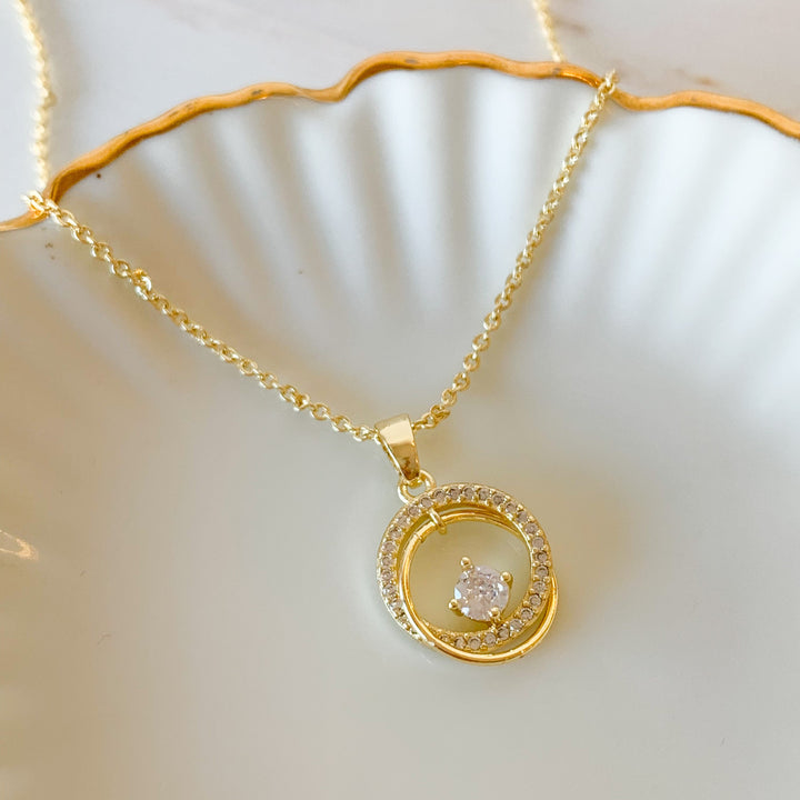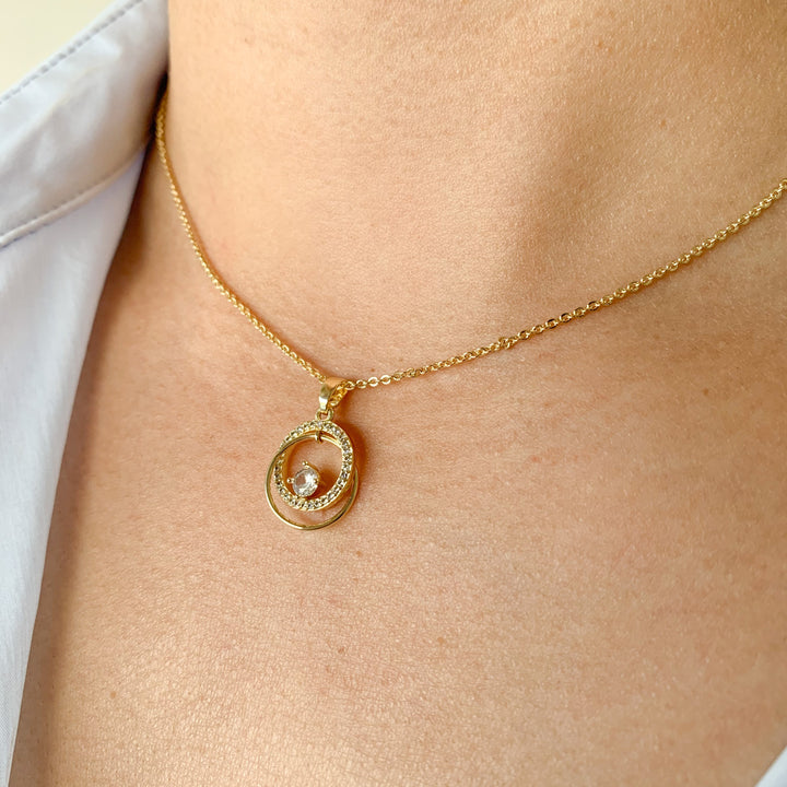 Un toque clásico y femenino. El dije de círculos dorados con brillito central es perfecto para looks sutiles pero con intención ✨