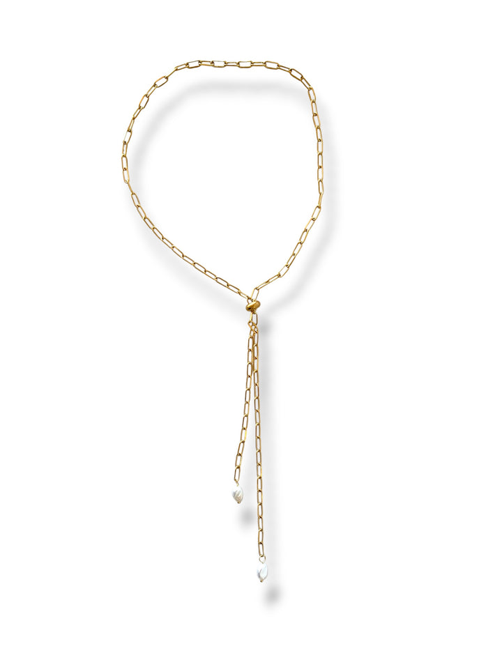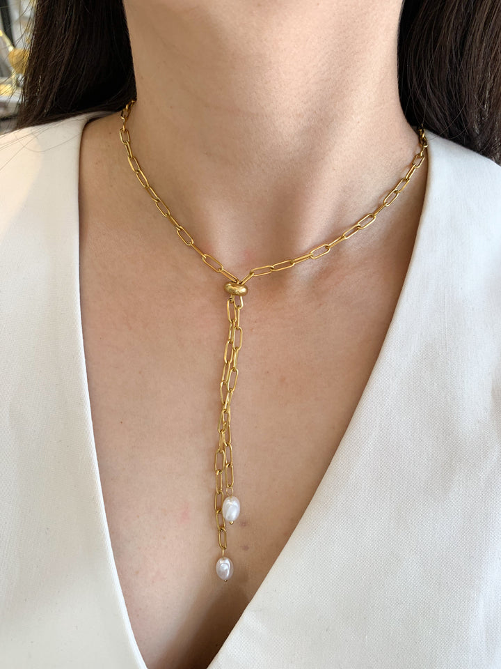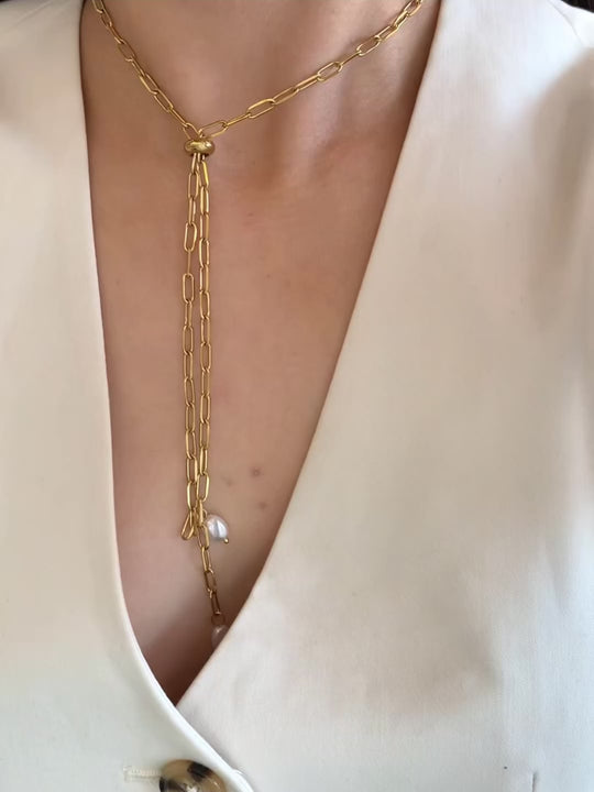 Minimalismo chic 🤍 El diseño de cadena dorada estilo corbatín finaliza con dos perlas colgantes que aportan movimiento y elegancia. Perfecto para usar con escotes en V o blusas abiertas
