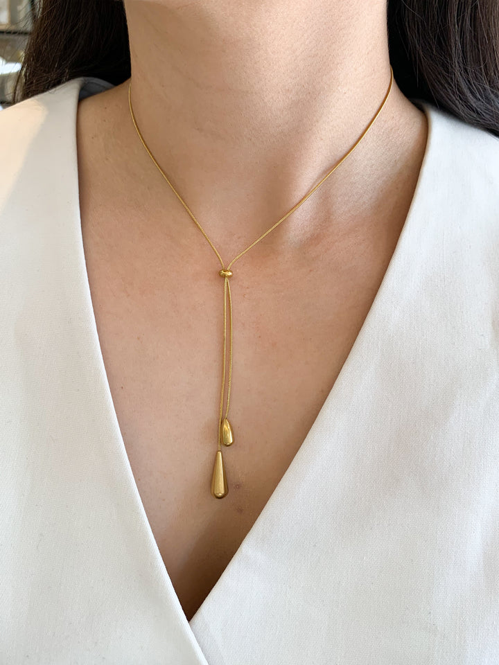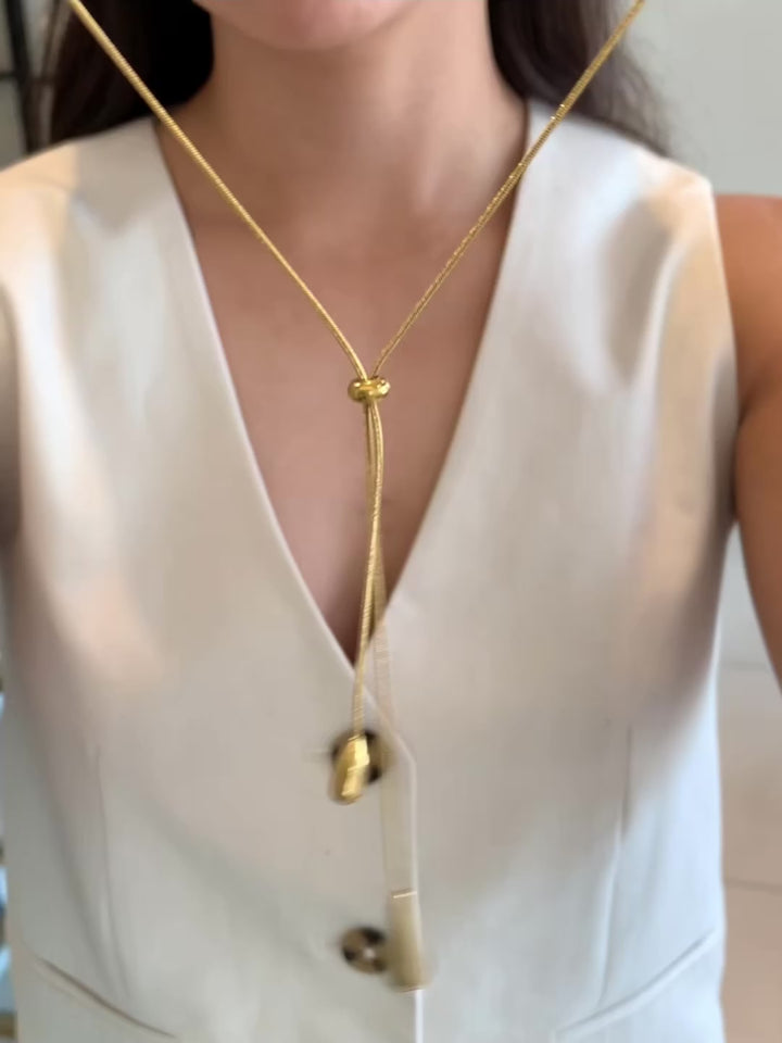 Sutil y elegante 🔗Un diseño sencillo pero lleno de estilo, con un fino cordón dorado que termina en dos péndulos que caen con gracia. Ideal para escotes profundos o camisas abiertas. Pura sofisticación minimalista
