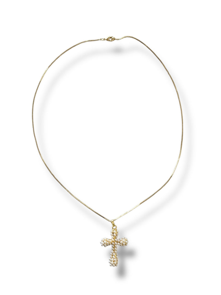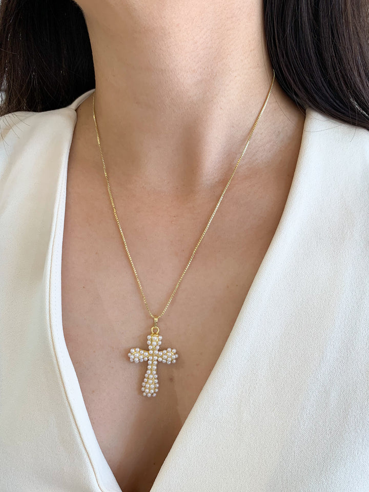 Collar cruz grande con perlas