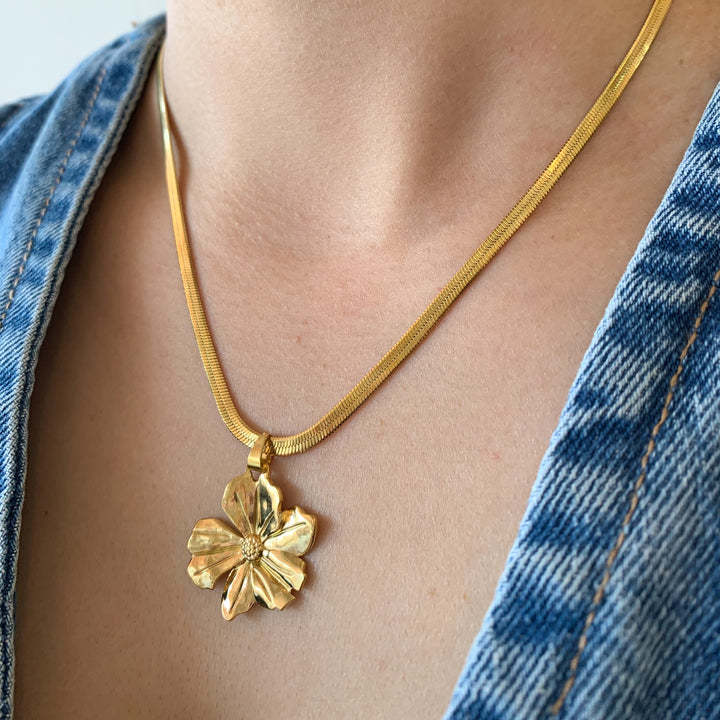 Romántico y con carácter 🌸 La flor dorada maxi sobre cadena planchada hace de esta pieza algo especial, ideal para destacar con un look femenino pero fuerte.