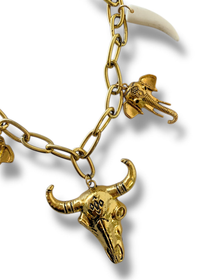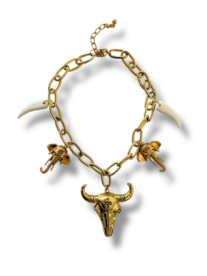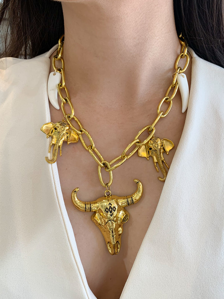 El diseño mezcla un dije de toro con figuras de elefantes, todo en dorado brillante. Un collar para quienes aman destacar con accesorios únicos y con energía poderosa