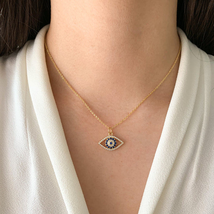 Símbolo de protección + estilo. El dije de ojo con cristales en silueta fina le da un aire boho‑moderno que se ve genial con layering 🧿