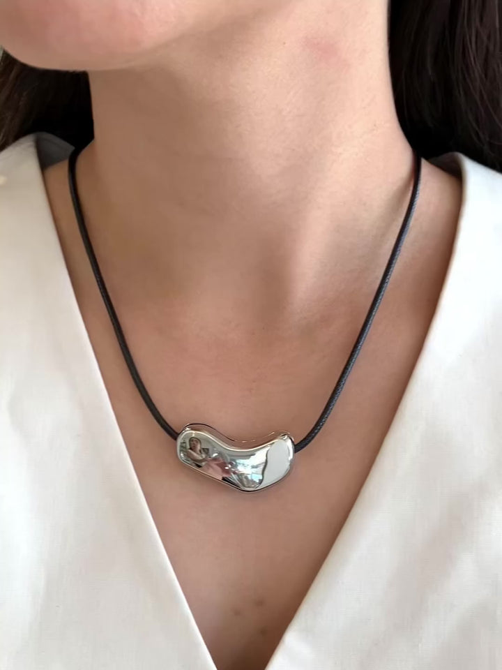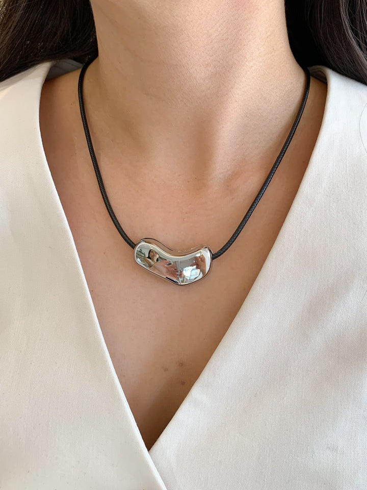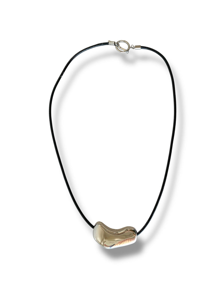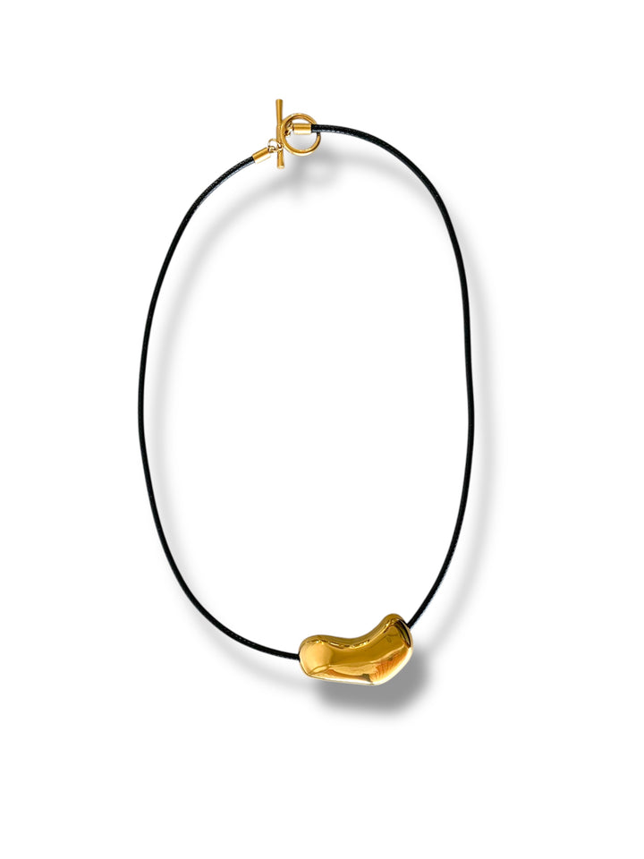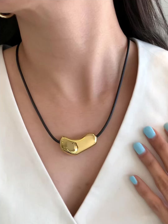 Diseño artístico y único 🎨. Este collar destaca por su placa dorada de forma orgánica montada sobre cordón negro. Ideal para un look moderno con inspiración escultórica. ¡Una joya con actitud!