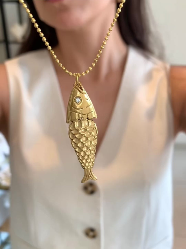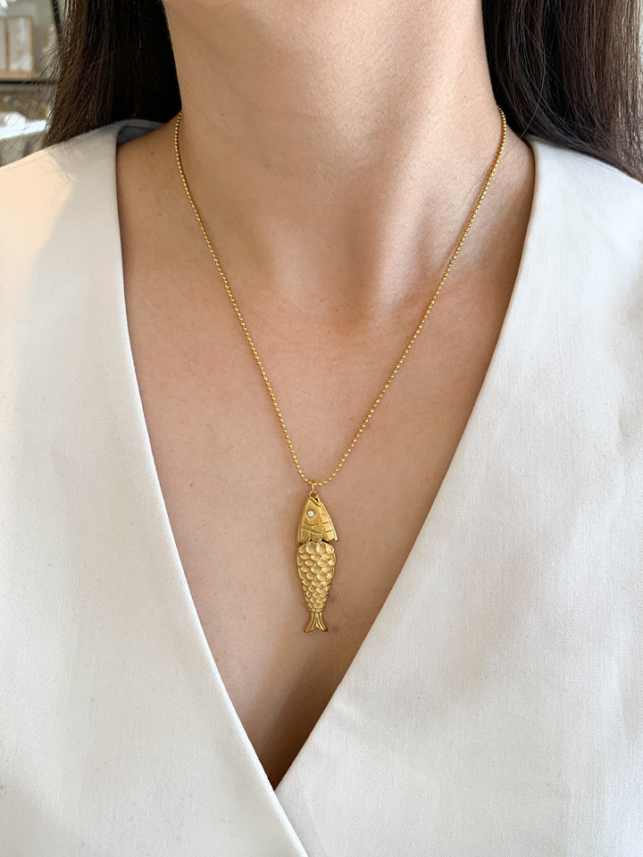 🐟✨ Este collar con diseño de sardina en acabado dorado, perfecto para quienes aman mezclar simbología con moda. Combina genial con cadenas simples o looks monocromáticos.