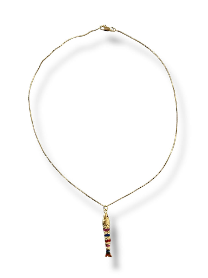 Un diseño encantador y fuera de lo común 🐟✨Este collar combina una figura de sardina en tono dorado con detalles coloridos, creando un look alegre y con mucha personalidad. Ideal para quienes aman los accesorios originales