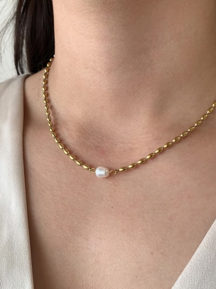 Delicado y femenino. La perla al centro le da ese toque clásico que nunca pasa de moda, mientras que la cadenita de semillitas le suma textura y movimiento 🤍