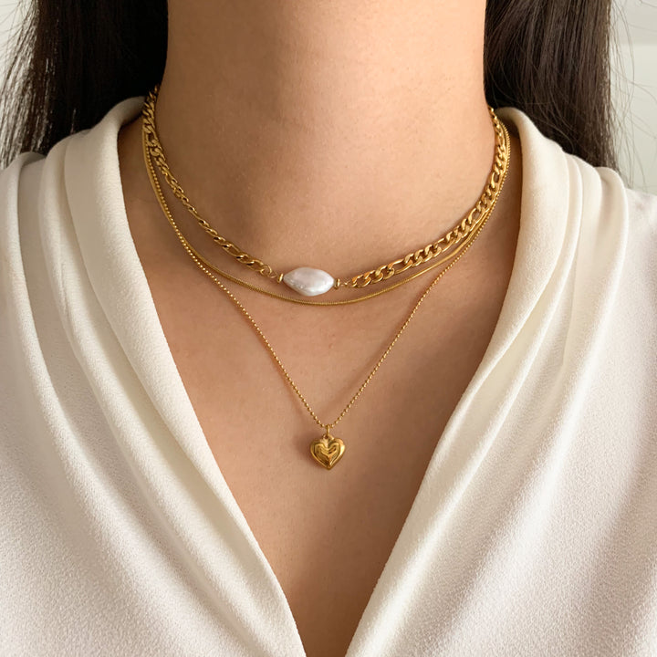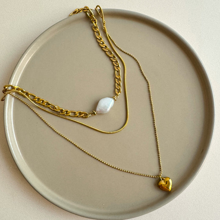 Medida: Cadena con perla 34 cm / Cadena skinny 39cm / Cadena con corazón 47cm / extension 5 cm