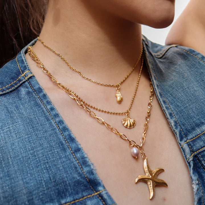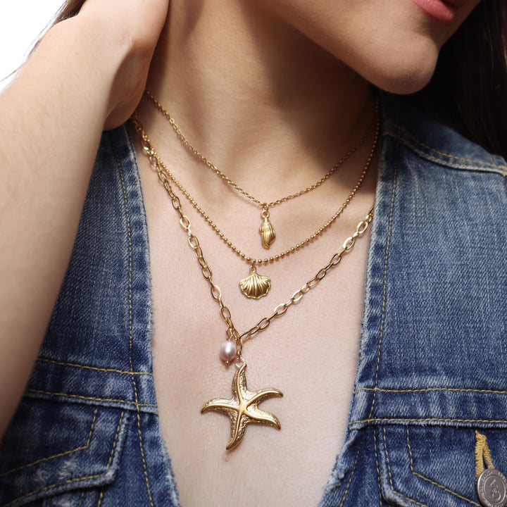 Un collar que grita vacaciones eternas 🌞🐚 Con sus tres niveles de cadena dorada, dijes de conchitas y una estrella de mar espectacular, esta pieza es perfecta para darle un toque tropical, bohemio y femenino a cualquier outfit🌟