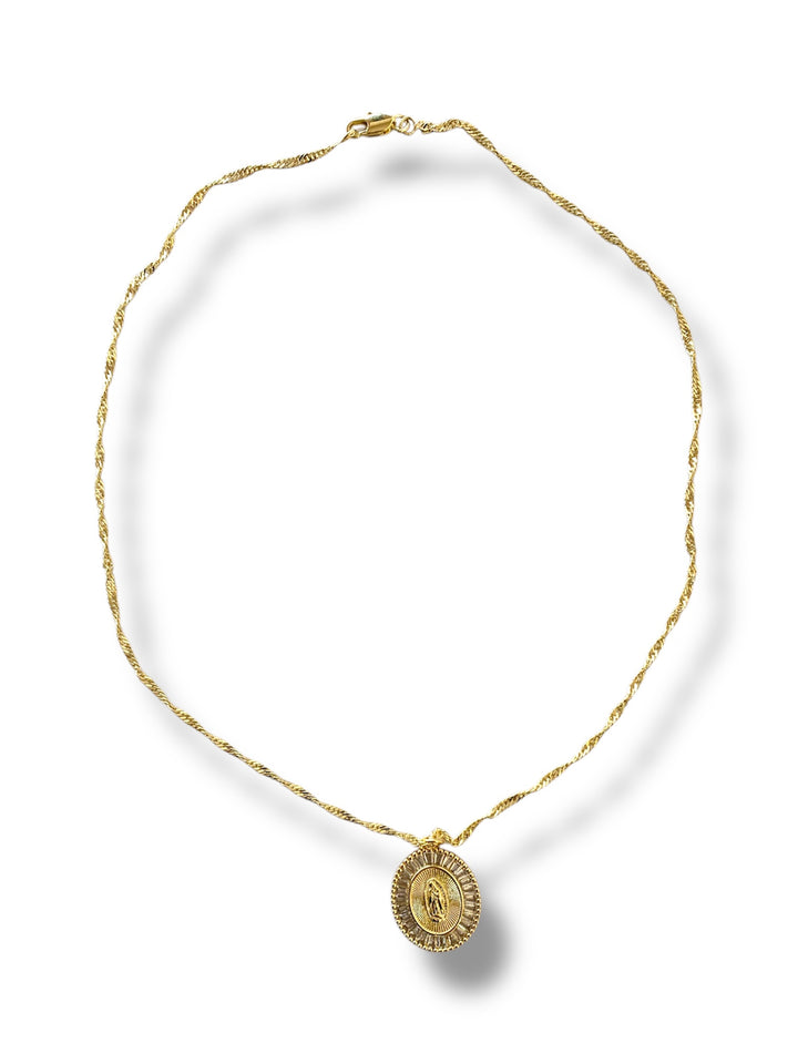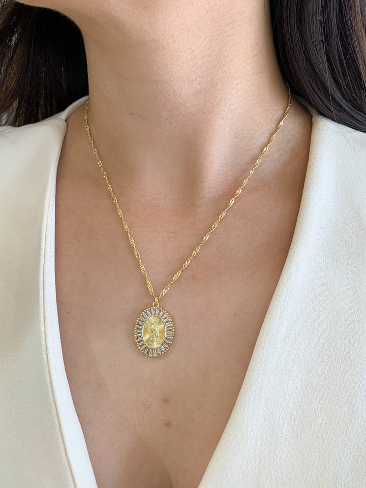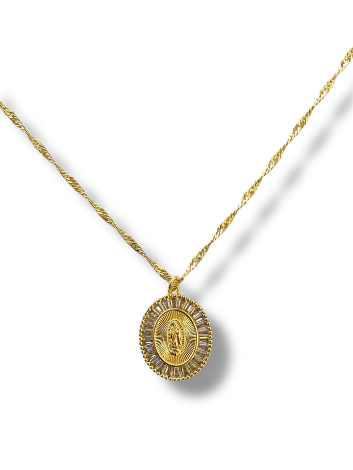 Devoción con un toque de brillo ✨⛪Medalla ovalada dorada con la imagen de la Virgen al centro, rodeada de zirconias que aportan un resplandor delicado. Ideal para regalar o llevar como protección y fe con estilo