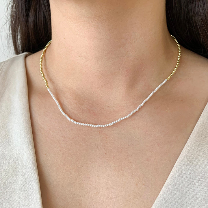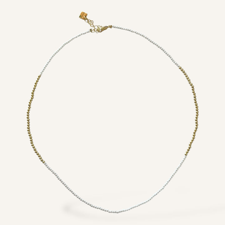 Minimalista pero especial. Esta gargantilla combina cuentas blancas y doradas en un diseño delicado que va con todo. Ideal para usar sola o en layering ✨