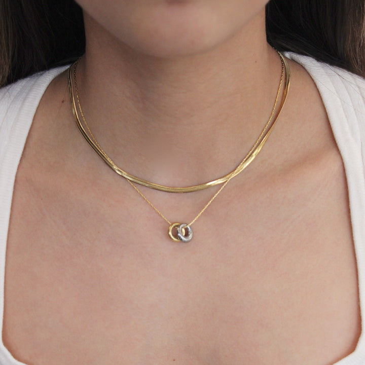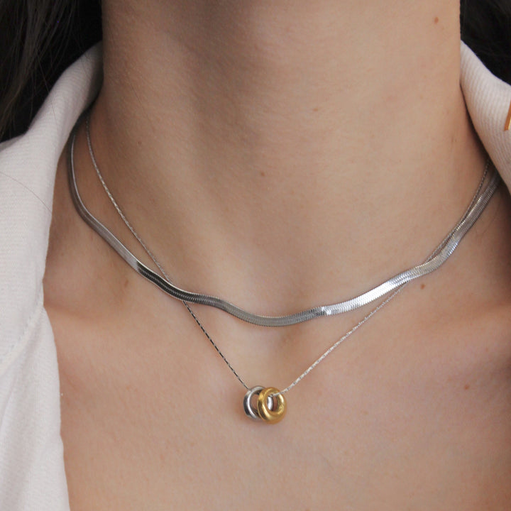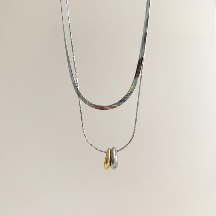 Dos cadenas diferentes conjuntas: una plana y otra con eslabones finos. Diseño elegante, sobrio pero con onda moderna. Va perfecto con escotes abiertos o cuellos sencillos. 🌿