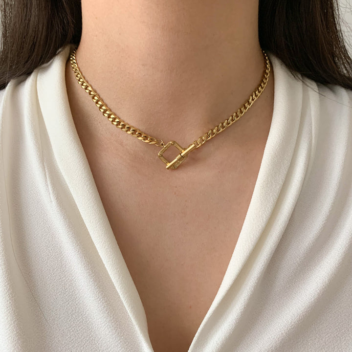 Cadena gruesa con cierre decorativo tipo candado + dije rombo. Muy estilo urbano-chic. Perfecta para looks casuales que quieres subir de nivel 🔒