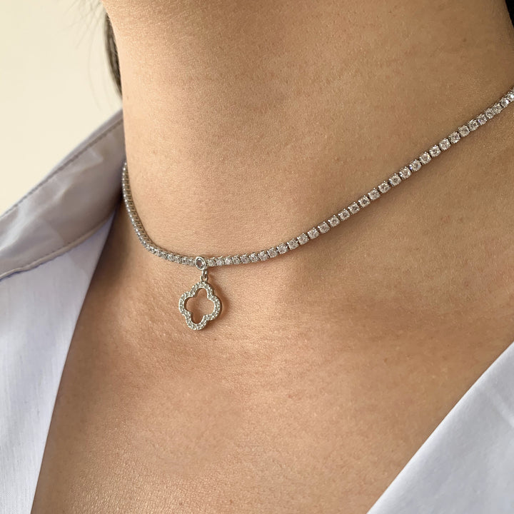 Un clásico reinventado 🍀 Esta gargantilla tipo tennis con un charm de trébol brillante en el centro mezcla elegancia con ese toque de buena suerte que siempre queremos llevar cerca 💖