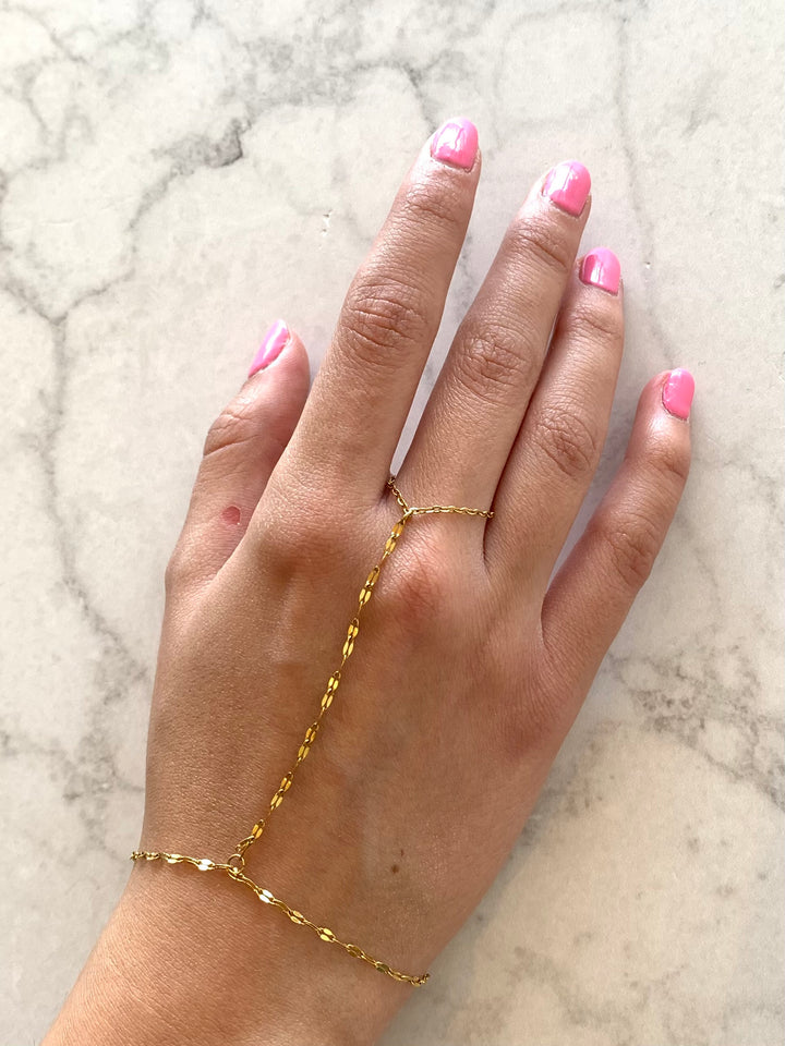 Diseño sencillo y elegante que conecta muñeca y dedo con una cadena tipo figaro. Hecho en acero, es resistente y moderno, ideal para llevar a diario 🔗