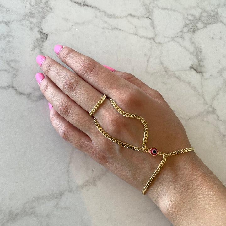 Protección y estilo en una sola pieza 💫. Esta hand chain dorada tiene un toque especial gracias al dijecito de ojito rojo, un amuleto chic para llevar siempre contigo