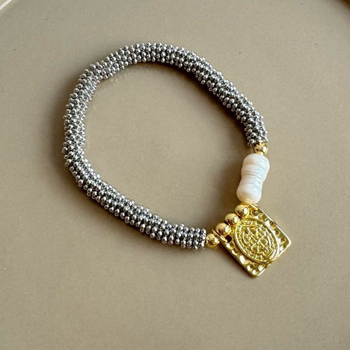 Para las que aman lo simbólico y elegante 🙏. Pulsera con cuentas plateadas + detalles dorados y medalla de San Benito.