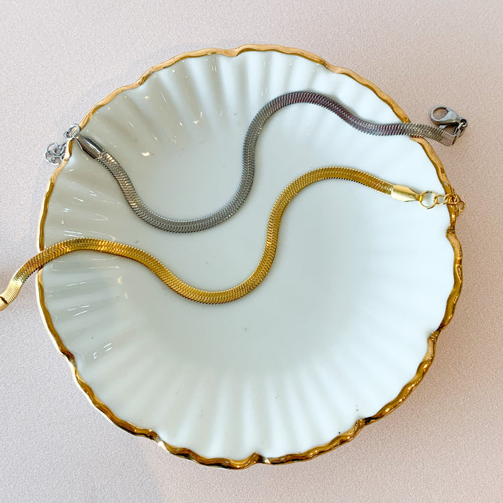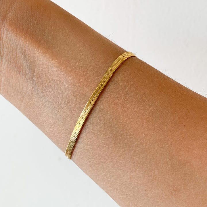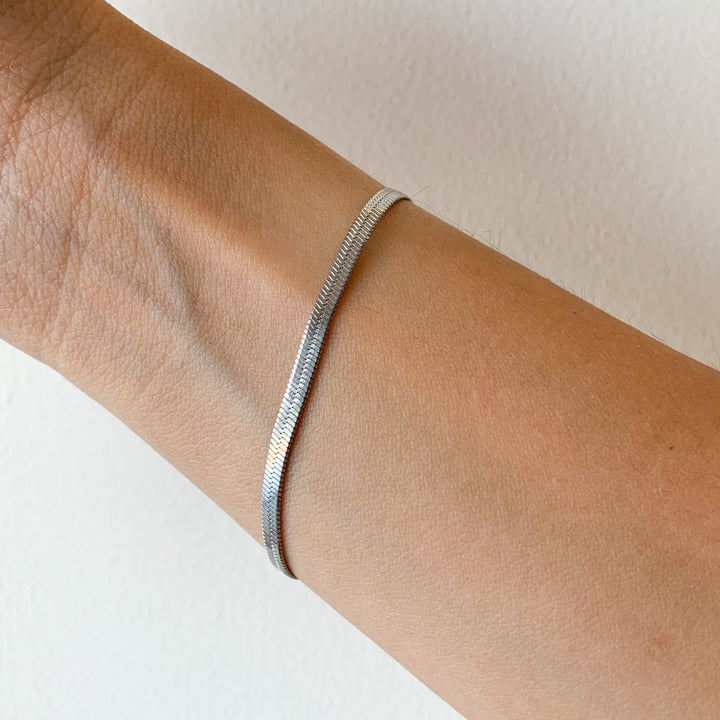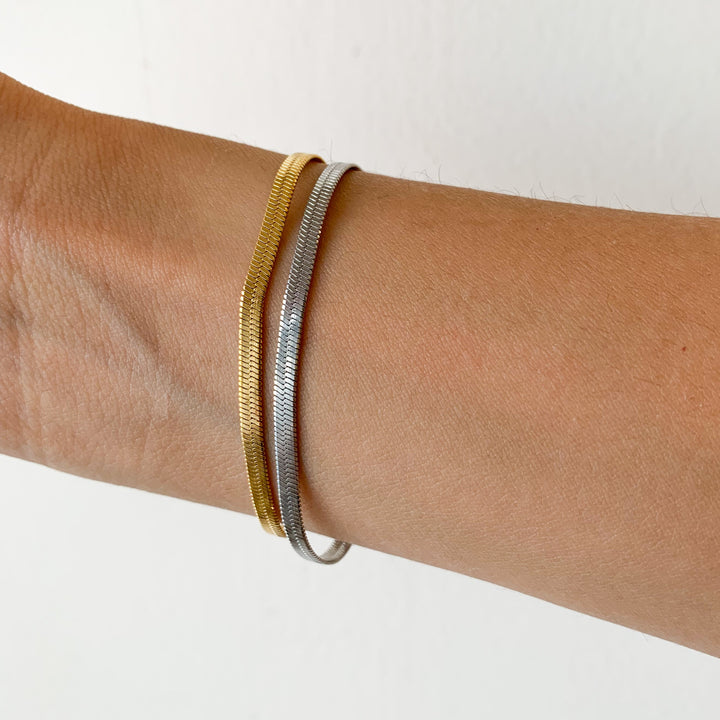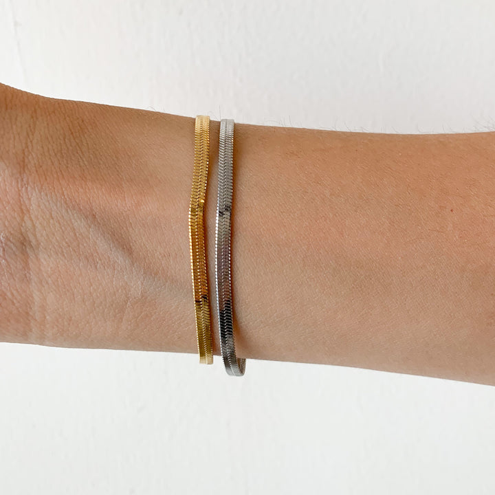 Minimalista, ligera y chic 💫. Disponible en dorado y plateado, esta pulsera tipo cadena planchada va increíble con todo y es ideal para usar diario.