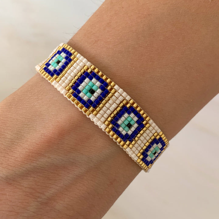 Llena de color, detalle y significado 🧿✨. Esta pulsera tejida con patrón de ojitos no solo es llamativa, también es perfecta para atraer buena vibra. Úsala sola o en stack para un toque artesanal y lleno de personalidad.