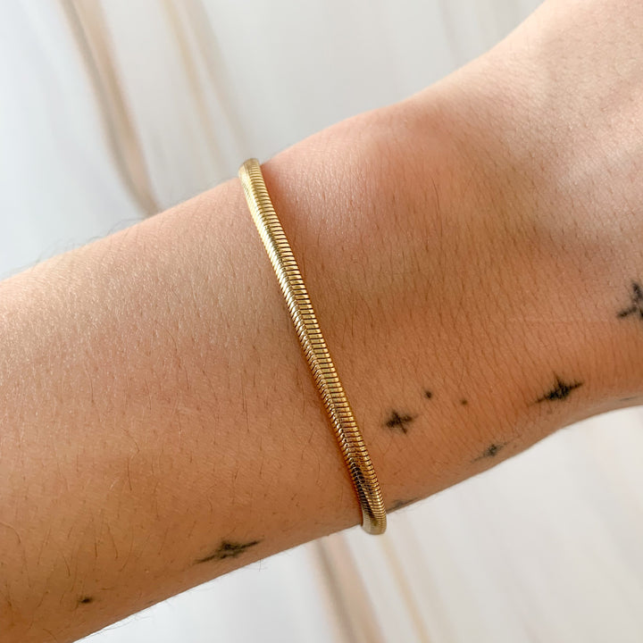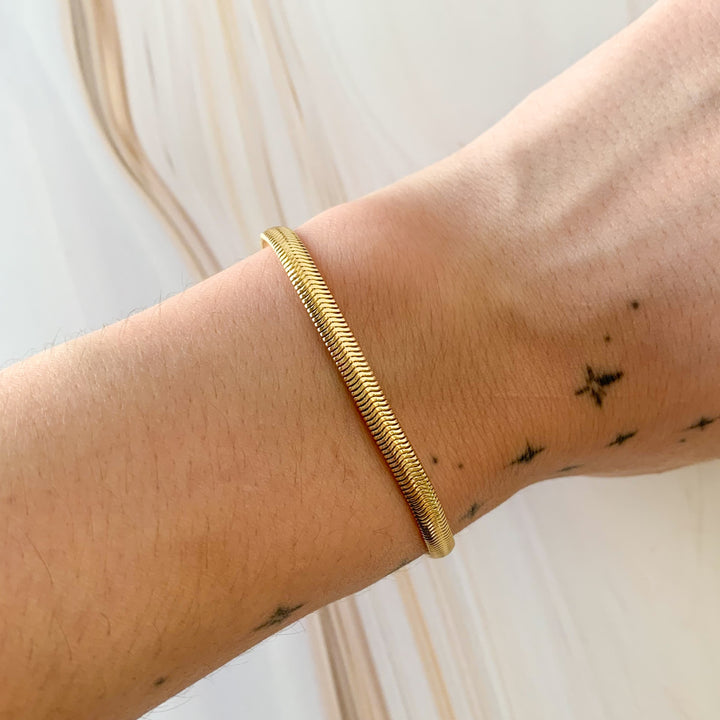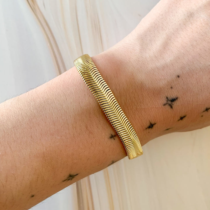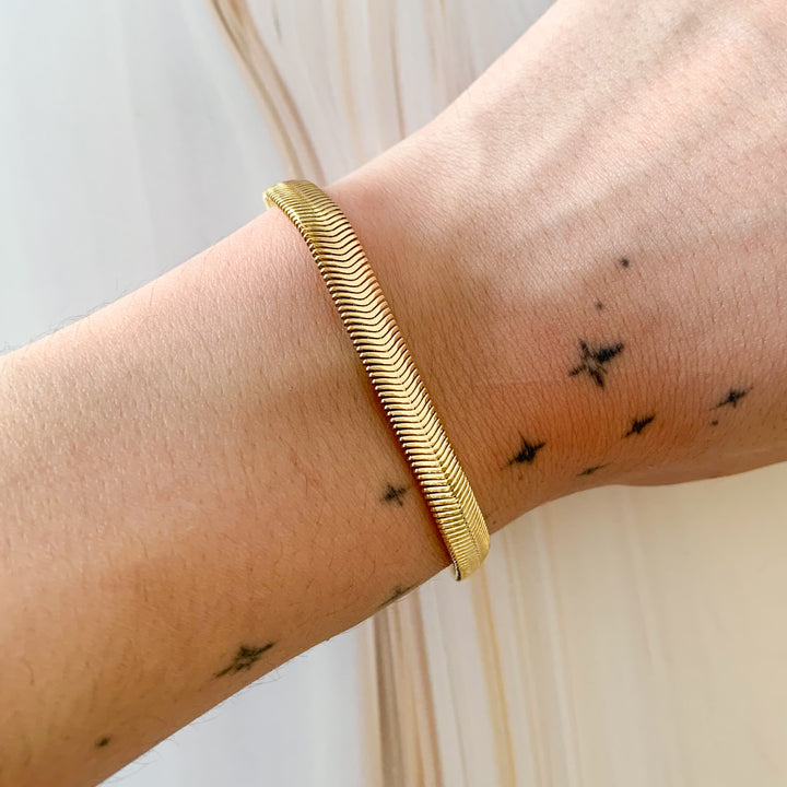Súper ligera, brillante y con ese efecto tipo “serpiente” que se acomoda increíble en la muñeca 🐍💛. Un básico moderno que le da un toque pulido a cualquier outfit. 🌟🌸