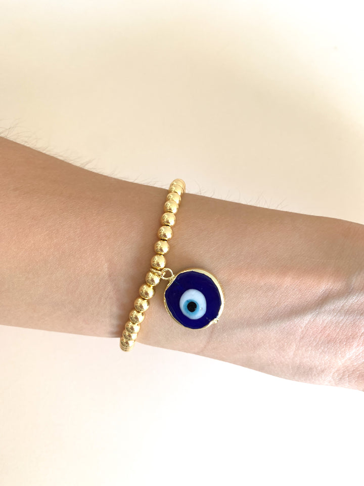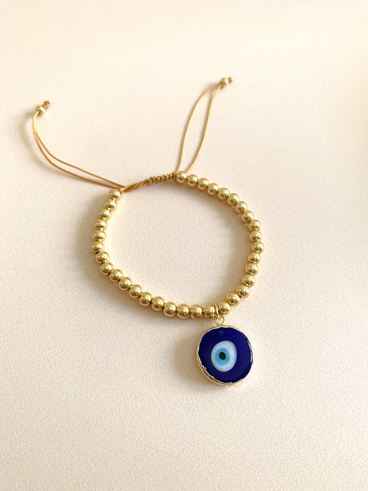 Un toque turco + mucha onda ✨. Esta pulsera de bolitas doradas con dije de ojo turco azul tiene presencia sin ser pesada. Perfecta para usar con looks boho, básicos o incluso de salida.