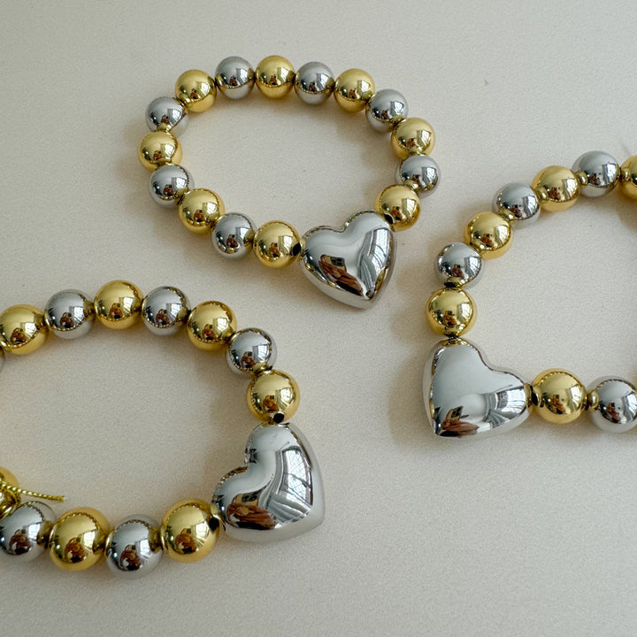 Love vibes suaves ❤️. Combina bolitas doradas y plateadas con dije de corazón. Sutil pero muy dulce. Funciona lindísimo como layering con otras pulseras finitas.