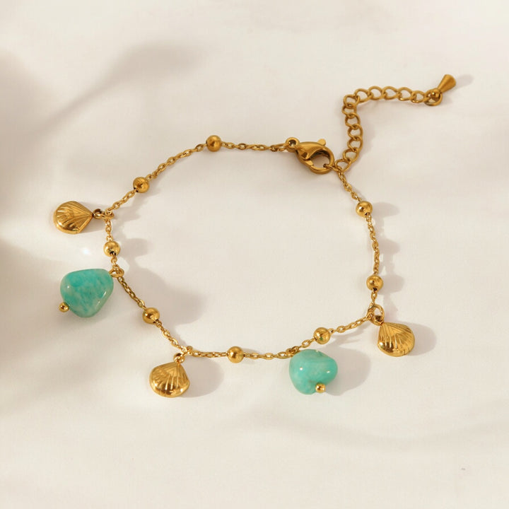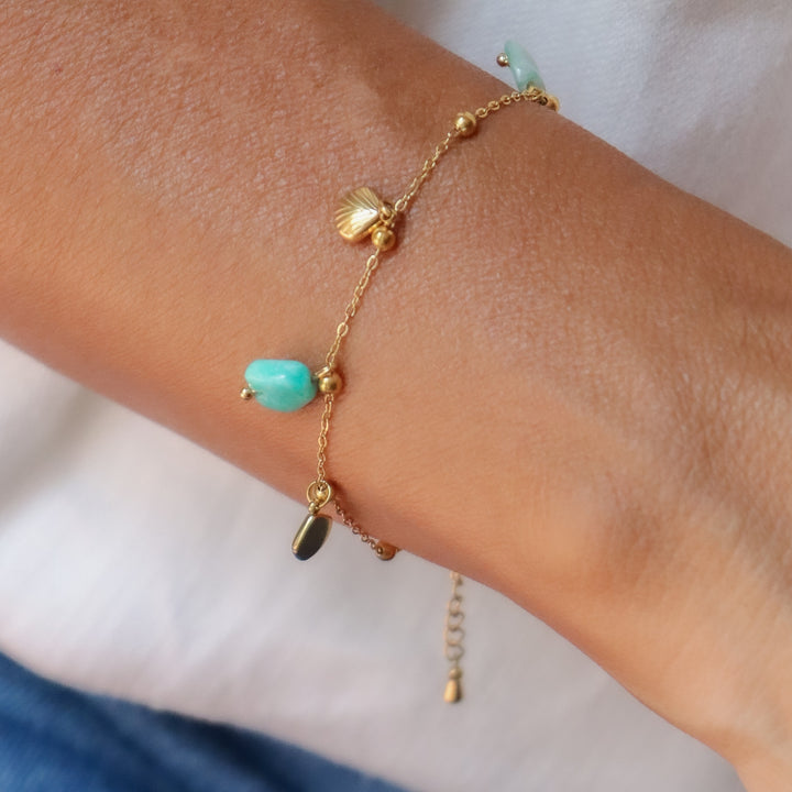 Brisa playera para tu muñeca 🐚. Conchas doradas + cuentas turquesas, para ese mood vacaciones aunque estés en la ciudad. Divertida y perfecta para combinar con accesorios dorados.
