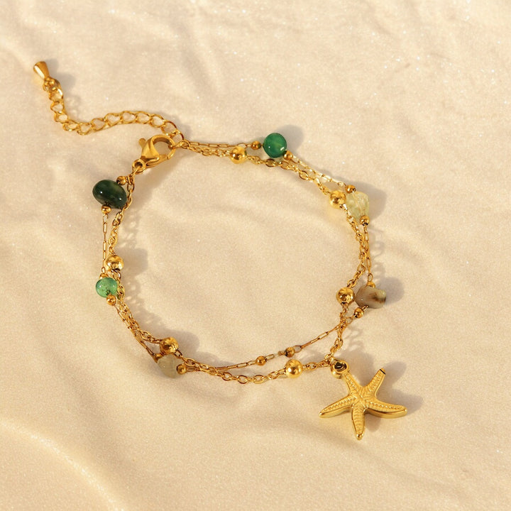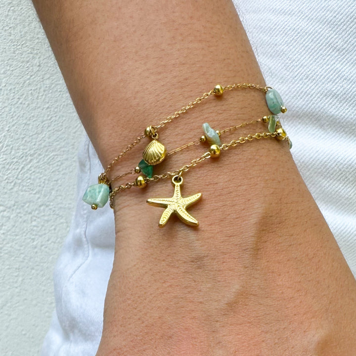 Doble capa de encanto veraniego 🌟. Estrella de mar colgante + cadena dorada + cuentas delicadas — ese tipo de pulsera que cuenta historia.