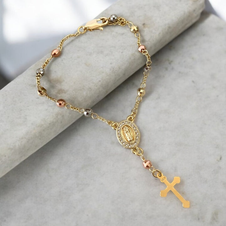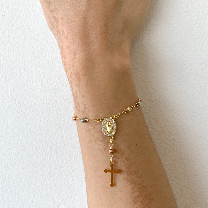 Pulsera en tres tonos (dorado, plateado y rosado) con medalla de la Virgen y cruz. Un diseño lleno de significado espiritual, ideal para llevar protección con mucho estilo🙏✨