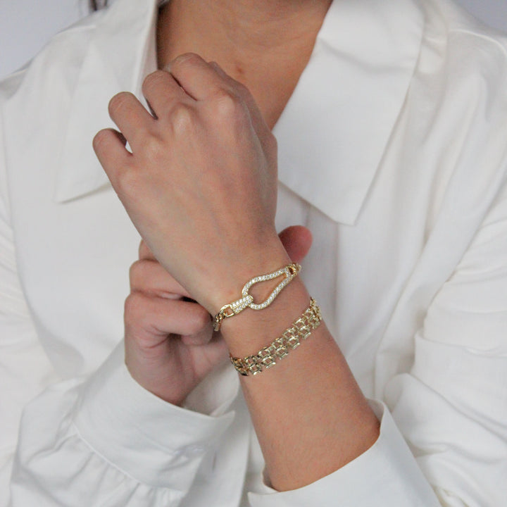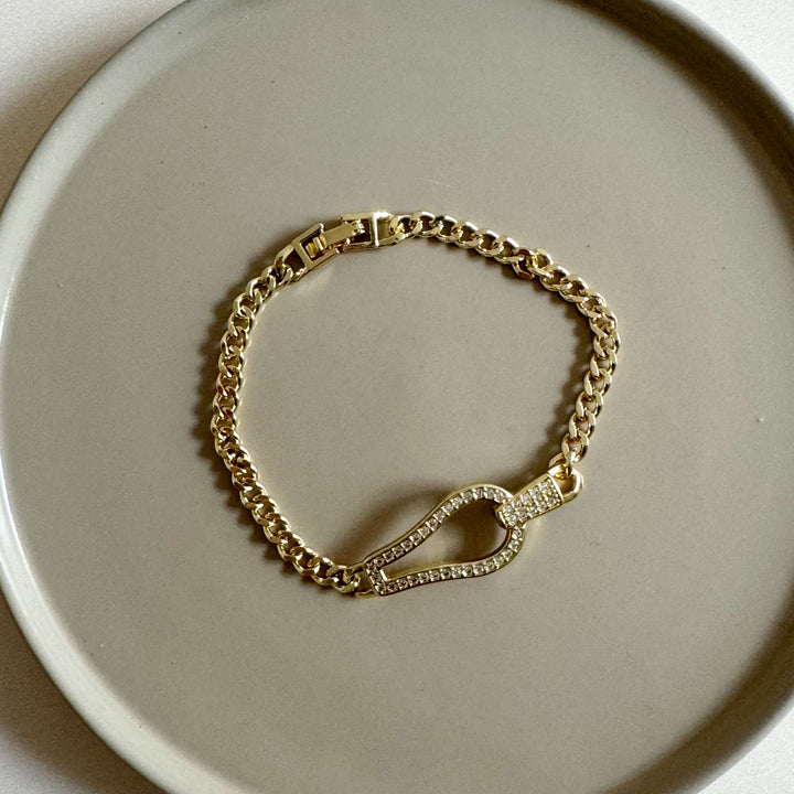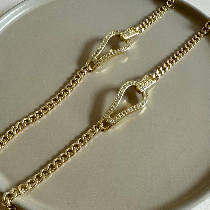 Diseño moderno y geométrico ✨. Tiene un dije tipo eslabón con brillos que le da un toque especial. Se ve divina sola o con otras cadenas finas.