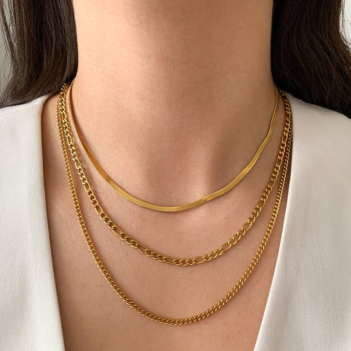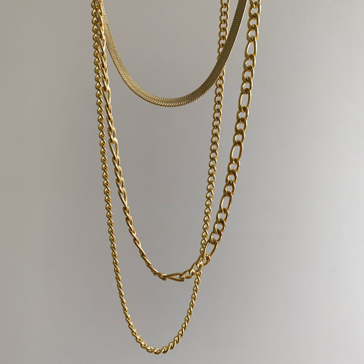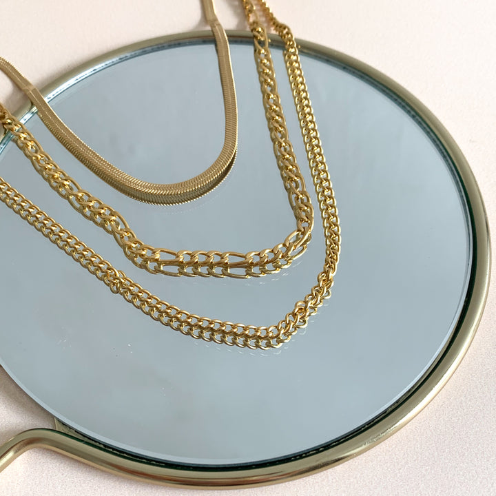 Tres cadenas que combinan texturas: una serpentina, una plana, otra con eslabones. Puedes usarlas juntas para layering ya listo, o separadas según el mood 🔗